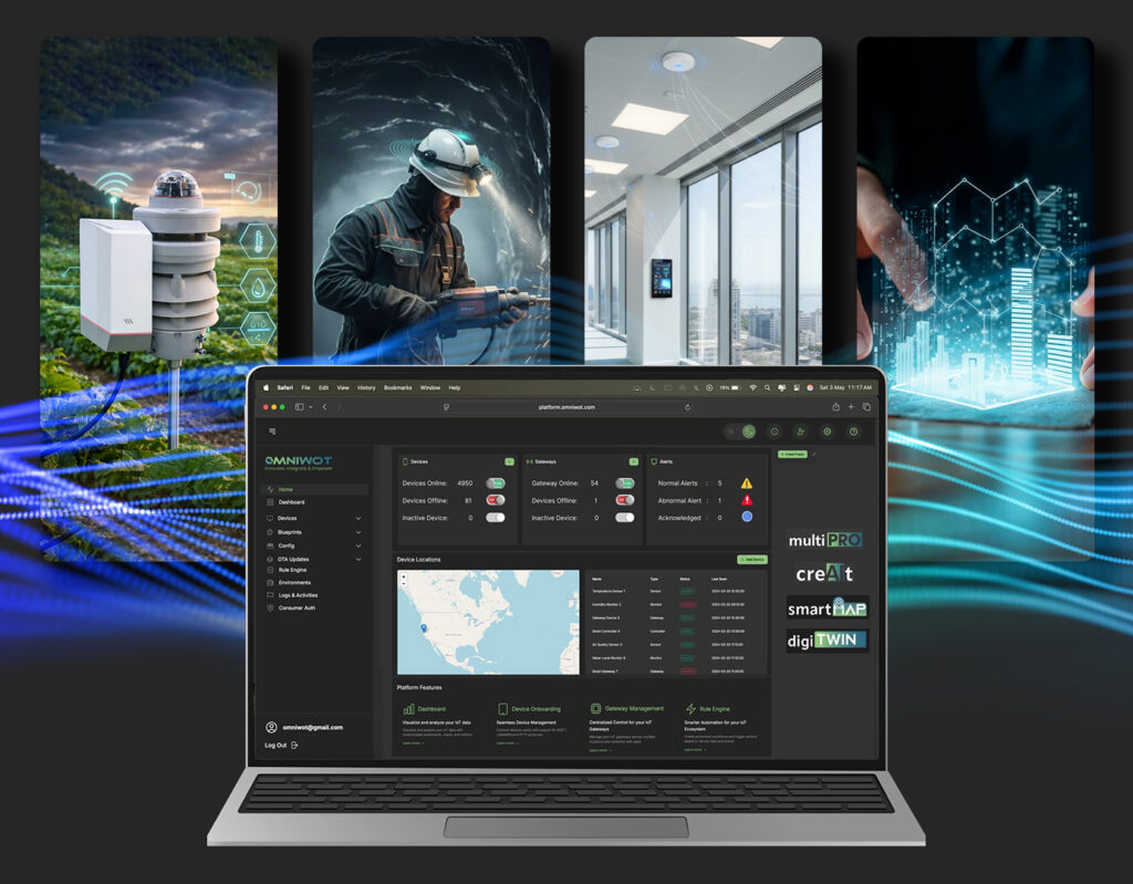 OmniWOT offers cutting-edge solutions tailored to a variety of industries, including Health Care, Mining, IT Infrastructure, Facility Management, Smart Parking, and Multi-Location businesses. Whether you’re managing Industries & Factories, optimizing Agriculture, enhancing Cloud Software, or creating a smarter living environment with our Smart Home Kit, OmniWOT delivers scalable and innovative technologies to meet your unique needs. Empower your operations with smart, reliable solutions for today’s connected world.
